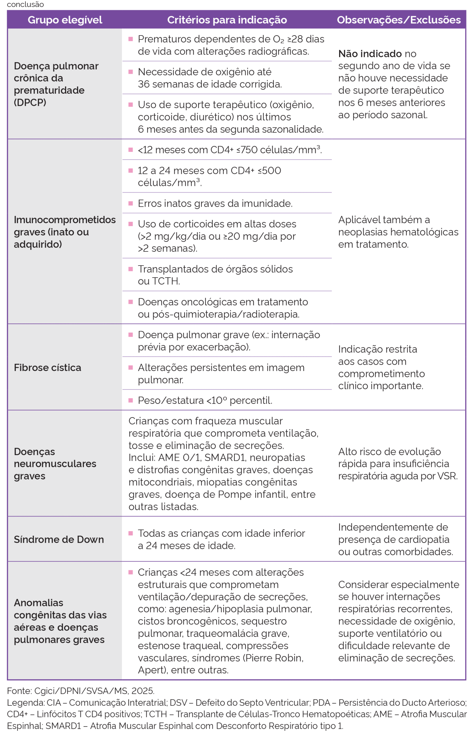 Veja a lista completa das comorbidades elegíveis no quadro abaixo, retirado do Informe Técnico sobre o Nirsevimabe do Ministério da Saúde, 2026.